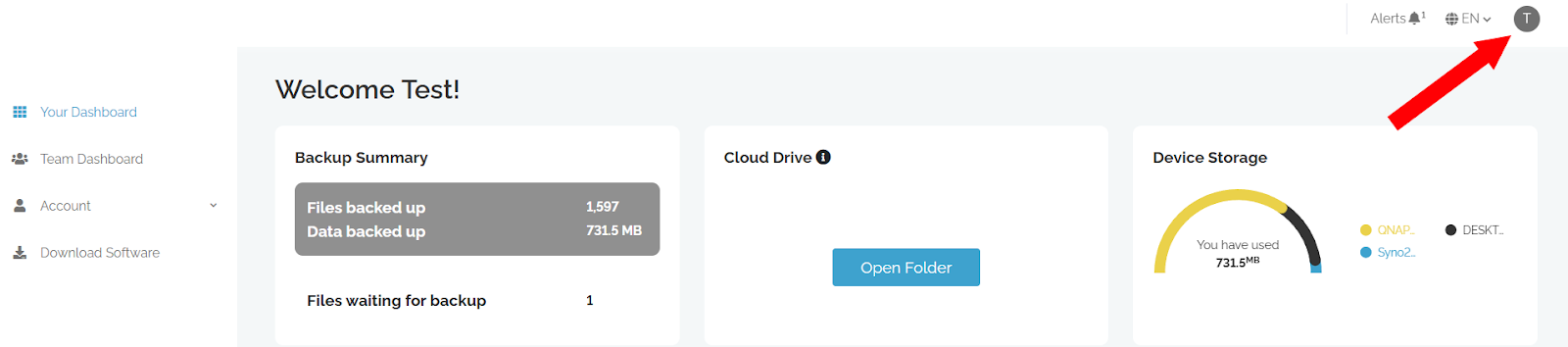 - On the dashboard click your user icon icon in the top right.